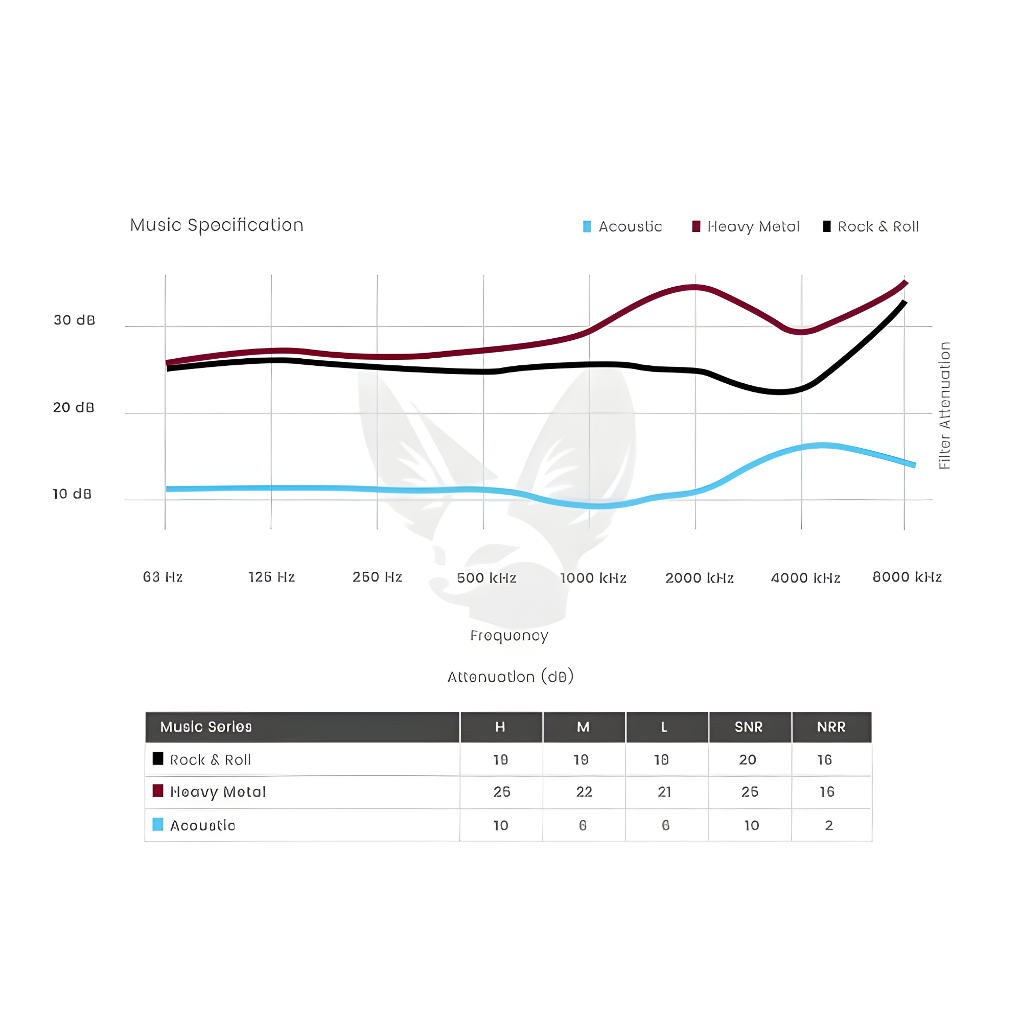 For quieter or more acoustic settings, this chart shows how ear protection performs at reducing lower frequencies while maintaining clarity.